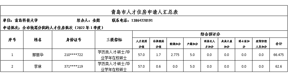 威尼斯官网申请青岛市统筹分配的人才住房(2022年1季度)人员情况公示